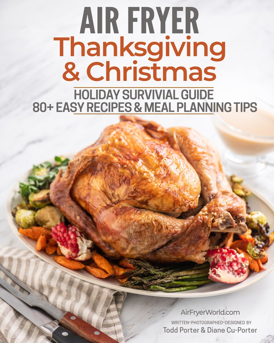 ULTIMATE HOLIDAY SURVIVAL GUIDE with 80+ recipes for air frying your favorite dishes. Whole turkey with gravy, prime rib, lamb chops, roasts and side dishes are easy! We'll show you how to air fry classic holiday desserts like pumpkin pie and cheesecakes.